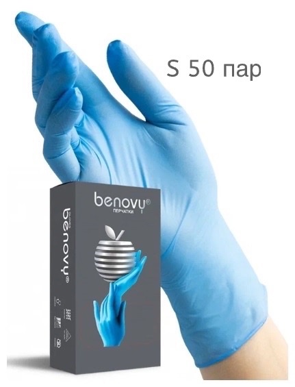 - Benovy Перчатки нитриловые Голубые текстурированные, неопудренные, размер S, 50 пар (100 шт)